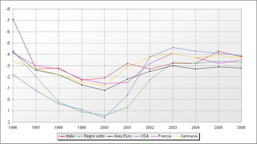 Fonte: Per i dati di consuntivo dei paesi europei, Commissione UE, Autumn 2005 Economic forecasts (novembre 2005); per il 1996-1999, cfr. rapporti precedenti della Commissione. Per l’Italia, i consuntivi relativi agli anni 2001-2004 sono tratti da ISTAT, Conti ed aggregati economici delle Amministrazioni pubbliche – Serie SEC95 – anni 2001-2004 (22 luglio 2005).