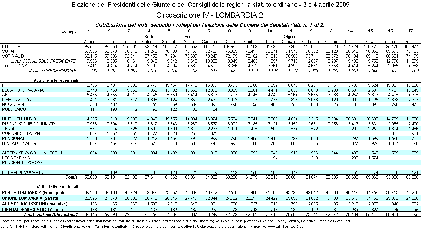 I dati, aggregati per comune, sono stati forniti dal Ministero dell’interno – Dipartimento per gli affari interni e territoriali – Direzione centrale per i servizi elettorali. Ancora nel sito internet del Ministero dell’interno, all’indirizzo http://regionali.interno.it/ind_regio.htm sono riportati i risultati aggregati per provincia e per regione sia della votazione per le liste regionali (e per i candidati alla carica di Presidente della regione), sia per le liste circoscrizionali. Tra questi dati non sono presenti però i risultati delle votazioni svoltesi nelle regioni Toscana e Puglia. Queste due regioni hanno emanato una propria legge elettorale che differenzia per taluni aspetti il sistema di elezione del Presidente della giunta e del Consiglio regionale da quello della legge n. 108 del 1968, sostanzialmente confermato dalle altre regioni a statuto ordinario. I risultati delle votazioni svoltesi in queste due regioni sono consultabili rispettivamente all’indirizzo internet http://www.elezioni2005.toscana.it/ e al sito http://www.prefettura.bari.it/Jahia/site/utg.