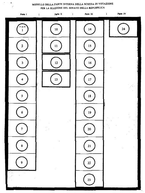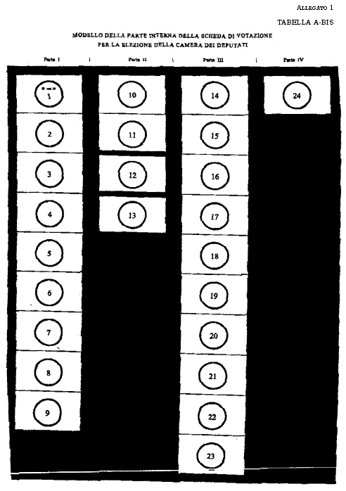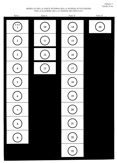 2. Sulle schede per l'attribuzione dei seggi i contrassegni delle liste collegate appartenenti alla stessa coalizione sono riprodotti di seguito, in linea verticale, uno sotto l'altro, su un'unica colonna. L'ordine delle coalizioni e delle singole liste non collegate, nonché l'ordine dei contrassegni delle liste di ciascuna coalizione sono stabiliti con sorteggio secondo le disposizioni di cui all'articolo 24. I contrassegni devono essere riprodotti sulle schede con il diametro di centimetri tre».
