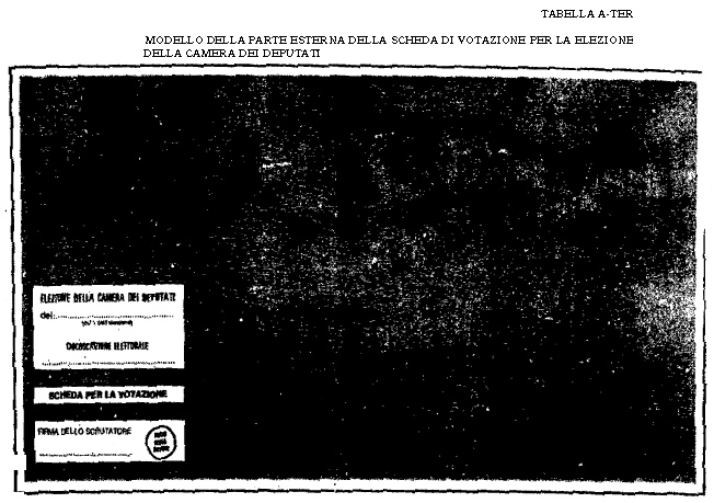 «Art. 31. - 1. Le schede sono di carta consistente, sono fornite a cura del Ministero dell'interno con le caratteristiche essenziali del modello descritto nella tabella B allegata al presente testo unico e riproducono in fac-simile i contrassegni di tutte le liste regolarmente presentate nella circoscrizione, secondo le disposizioni di cui all'articolo 24.