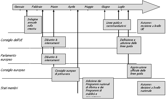 Ø febbraio/marzo: il Consiglio europeo elabora le linee guida di politica economica e di bilancio a livello UE e a livello di Stati membri;