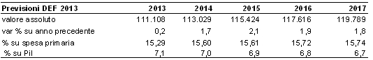 Le previsioni per il 2013 e gli anni 2014-2017Per quanto riguarda l'esercizio in corso ed il successivo periodo 2014-2017, il Documento di economia e finanza (DEF) presentato nell'aprile 2013 reca le seguenti stime: