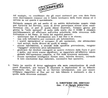 SIRACUSA SERGIO, ex direttore del Servizio per le informazioni e la sicurezza militare (SISMI). Direttore della 8o Divisione era Giuseppe Grignolo. Sono tutte informazioni che il direttore del servizio può fornire.