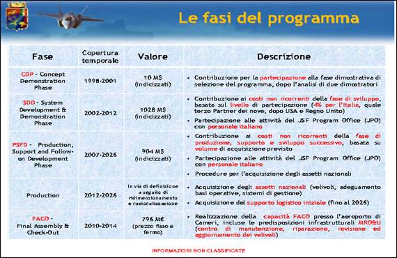Si riporta di seguito il quadro ricapitolativo della partecipazione italiana alle cinque fasi del programma JSF, fornito tra gli altri documenti, in occasione della citata audizione: