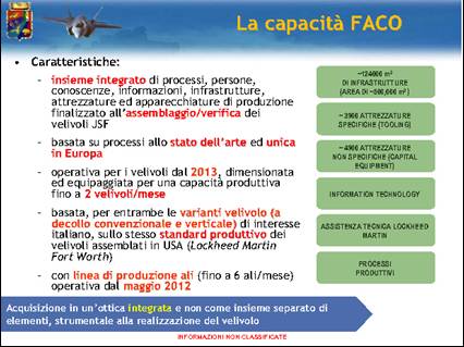 Ø il ritorno tecnologico-industriale è legato alla Final Assembly and Check Out (Faco) di Cameri, che darà occupazione a 1.500 persone e circa 10.000 con l’indotto[12]. La Faco sarà pronta nel 2014 per iniziare la produzione nel 2016, ed è previsto che rimanga attiva per almeno 40 anni;