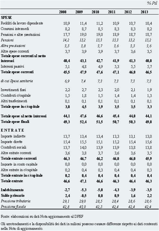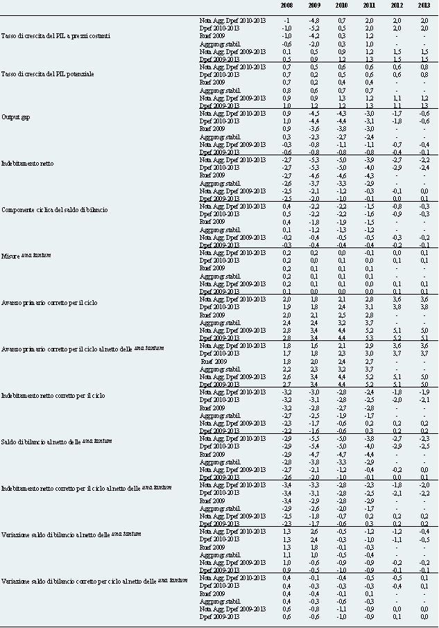 Le stime tendenziali e programmatiche del fabbisogno del settore statale e del settore pubblico sono fornite nella Nota di aggiornamento, come nel DPEF 2010- 2013, in termini di PIL.