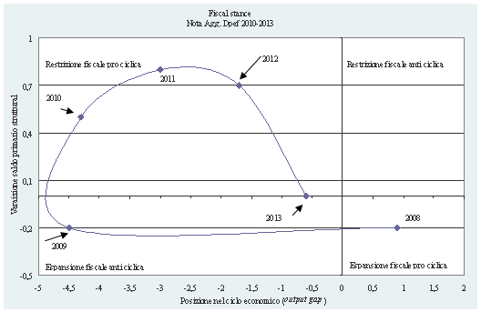 [16] In teoria, la politica di bilancio dovrebbe essere anti-ciclica, ossia restrittiva nelle fasi di espansione economica ed espansiva nella fasi di recessione. Nella pratica, negli ultimi anni molti paesi europei, in considerazione del bilancio pubblico in deficit, hanno dovuto adottare politiche pro-cicliche, cioè restrittive in fasi recessive, ai fini del rispetto dei parametri previsti dal Trattato di Maastricht. Sulla base del Patto di Stabilità e Crescita, i paesi dovrebbero mantenere il bilancio pubblico in sostanziale pareggio over the cycle, lasciando operare liberamente gli stabilizzatori automatici, ossia meccanismi economici, legati a fattori istituzionali, tendenti a contenere le fluttuazioni cicliche. Ciò implica, in termini del Grafico 3.1, che i paesi dovrebbero trovarsi sull’asse orizzontale (stance neutrale). I paesi che non hanno raggiunto il sostanziale pareggio di bilancio dovrebbero invece trovarsi in punti situati nei due quadranti superiori (politiche fiscali restrittive) ai fini del raggiungimento del pareggio.