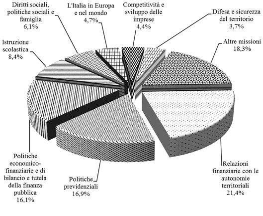 Delle 34 missioni del bilancio dello stato si sono escluse le voci considerate non rilevanti. L’elenco utilizzato è risultato composto di 19 voci, riportate di seguito, che possono essere confrontate anche con la classificazione delle spese COFOG in sede Ue.
