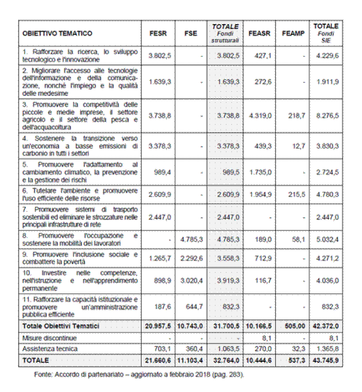 Nella tabella che segue, riportata nell'Accordo di partenariato, come revisionato a seguito della Decisione di febbraio 2018, è indicata l'allocazione finanziaria a livello nazionale, per Obiettivo Tematico, del complesso delle risorse comunitarie assegnate all'Italia, per un totale di 43,7 miliardi di euro, escluse cioè le risorse per l'Obiettivo "Cooperazione territoriale europea" (1,1 miliardi), in quanto tali risorse, ai sensi dei regolamenti comunitari, non sono programmate nell'ambito dell'Accordo di partenariato.