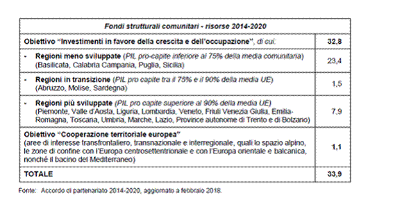 Riguardo alla programmazione dei Fondi strutturali, le risorse comunitarie assegnate all'Italia per i Fondi strutturali (FESR e FSE), considerando anche l'Obiettivo "Cooperazione territoriale europea", ammontano complessivamente a 32,2 miliardi di euro (con un incremento rispetto ai 28,8 miliardi della precedente programmazione 2007-2013, comprensivi dell'indicizzazione pari al 2% annuo), così ripartite tra i due obiettivi e tra le tre categorie di regioni beneficiarie