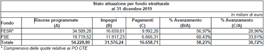 In merito all'attuazione finanziaria, al 31 dicembre 2019 lo stato di attuazione dei Fondi strutturali si attesta, per ciò che attiene agli impegni complessivamente assunti, ad un valore pari a oltre il 58,2% del contributo totale. Il livello dei pagamenti complessivi, rendicontati al 31 dicembre 2019, ha raggiunto oltre 16,7 miliardi, corrispondenti al 30,7% delle risorse programmate.