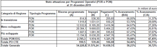 Le tabelle successive riportano le informazioni sullo stato di utilizzo dei fondi strutturali al 31 dicembre 2019 (quota europea + cofinanziamento nazionale) con riferimento agli impegni e i pagamenti rispetto alle risorse disponibili.