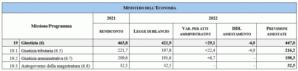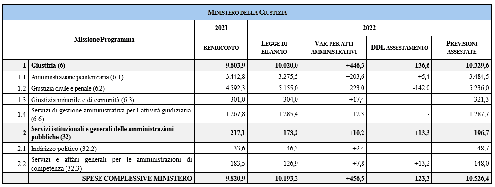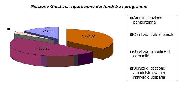 Analizzando gli specifici programmi della Missione Giustizia, si rileva che l'intervento più significativo del DDL assestamento riguarda il programma "Giustizia civile e penale", per il quale si propone una diminuzione dello stanziamento di 142 milioni di euro, imputato a spese di personale. Infatti, se gli stanziamenti per i magistrati aumentano di 55,7 milioni, quelli per il personale amministrativo si riducono di 210,8 milioni. Più contenuta è la modifica che interessa il programma "Amministrazione penitenziaria", per il quale il d.d.l. assestamento prevede un aumento delle dotazioni di 5,4 milioni di euro.
