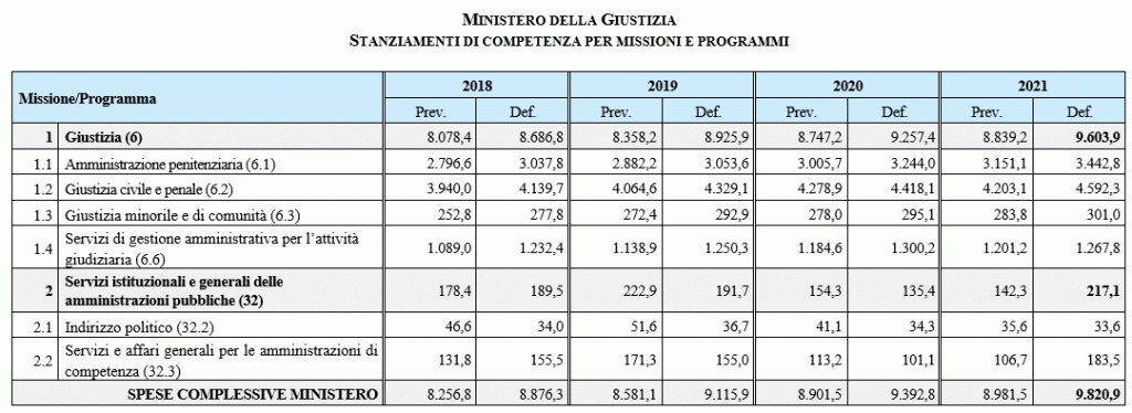 Con riguardo alle spese della missione 6 "Giustizia" (che da sola assorbe oltre il 98% delle risorse assegnate al Ministero), gli stanziamenti definitivi di competenza 2021 sono stati pari a 9.603,9 milioni di euro (sui 9.820,9 mln totali), in aumento del 3,7% rispetto al rendiconto 2020 (9.257,4 mln). All'interno della missione, gli stanziamenti per i 4 programmi risultanti dal rendiconto sono i seguenti: