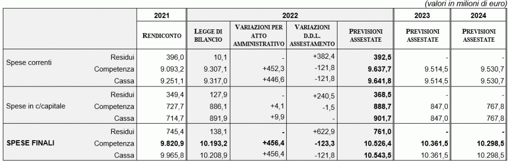 Assestamento 2022 (A.C. 3676)Con il disegno di legge di assestamento si correggono, a metà esercizio, le previsioni già contenute nella legge di bilancio per il 2022. Le previsioni di bilancio 2022Lo stato di previsione del Ministero della giustizia (tabella n. 5) per l'anno finanziario 2022 approvato con la legge n. 234 del 2021, recava previsioni di competenza per un totale di 10.193,2 milioni di euro, di cui 9.307,1 di parte corrente e 886,1 in conto capitale. L'assestamento corregge queste previsioni iniziali,