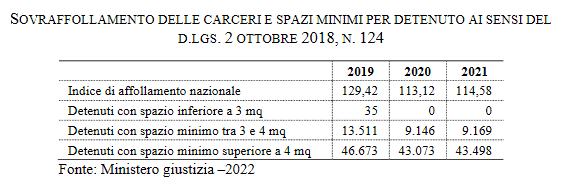 La Relazione della Corte dei Conti affronta poi ampiamente il tema del - edilizia penitenziariasovraffollamento carcerario - nonostante le misure deflattive applicate fino a luglio 2021 a causa del Covid - e del trattamento dei detenuti, anche in relazione al rispetto dei parametri imposti dalla Convenzione europea dei diritti dell'uomo.