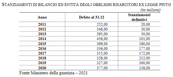 Per quanto riguarda le somme da corrispondere a titolo di equa riparazione, si evidenzia che per la riparazione per ingiusta detenzione (cap. 1312) nel 2021 sono stati stanziati 50 milioni di euro (confermata la previsione di bilancio), in aumento rispetto agli esercizi precedenti (44 mln nel 2020; 48,8 mln nel 2019; 48 mln nel 2018) e che la riparazione per violazione del termine di ragionevole durata del processo (cap. 1313) registra stanziati nel 2021 64 milioni di euro (confermata la previsione di bilancio). Nel rendiconto deMinistero dell'Interno (tab. 8)l Ministero dell'Interno, si segnala che il programma di protezione dei collaboratori di giustizia (cap. 2840) è stato finanziato nel 2021 per 74,6 milioni di euro (+4 mln rispetto alle previsioni), in leggera diminuzione rispetto all'esercizio 2020 (75,5 milioni di euro). Tra gli ulteriori capitoli di interesse della Commissione si segnala il cap. 2982, Fondo di rotazione per la solidarietà alle vittime dei reati di tipo mafioso, delle richieste estorsive, dell'usura, dei reati intenzionali violenti nonché per gli orfani di crimini domestici: 137,4 milioni di euro, a fronte di una previsione di 35,4 mln.