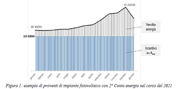 In figura 1 (ripresa dalla relazione illustrativa), è riportato un esempio dei possibili proventi ottenuti nel 2021 da un impianto fotovoltaico che ha avuto accesso al cosiddetto “secondo Conto energia” (incentivo fisso a 330 euro/MWh) e ha venduto l’energia prodotta sul mercato spot.