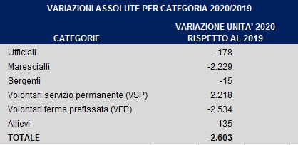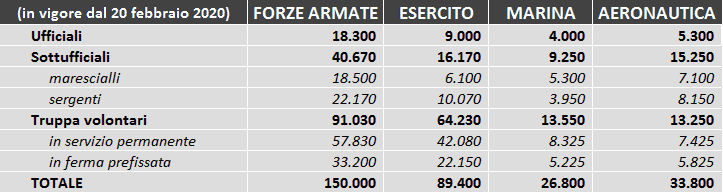 Fonte: Elaborazione Servizio Studi Camera - Dipartimento Difesa su dati articolo 798-bis del D. Lgs.66/2010, nel testo introdotto dall'art. 1, comma 1, lett. b), D.Lgs. 28 gennaio 2014, n. 8 (prima tabella, in vigore fino al 19 febbraio 2020) e come modificato dal D.lgs. 27 dicembre 2019, n. 173, di riordino dei ruoli e delle carriere del personale delle Forze Armate (seconda tabella, in vigore dal 20 febbraio 2020).