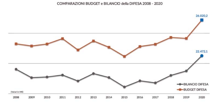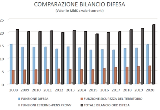 per il settore esercizio è stata particolarmente rilevante: si è arrivati - dal 2008 al 2020 - ad un taglio degli stanziamenti di circa il 22%, passando da 2,7Mld€ nel 2008 ai circa 1,7Mld€ del 2019 e a 2,1Mld€ nel 2020 (importo comprensivo delle dotazioni di Fondo Scorta, pari a circa 321M€, da intendersi come mere partite di giro necessarie a consentire alle F.A. di fronteggiare le maggiori esigenze di flessibilità conseguenti alla soppressione delle contabilità speciali).