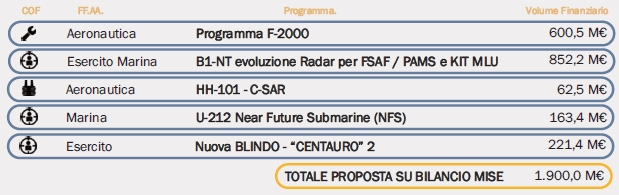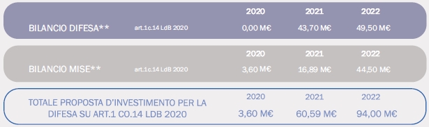 Nella LdB 2020-2022 il Fondo per il rilancio degli investimenti delle Amministrazioni centrali è stato rifinanziato per un ammontare complessivo di 20,8Mld€ in quindici anni, e la Difesa ha presentato una proposta dettagliata tesa a veder assentita una quota complessiva di 4,3Mld€ (2,4Mld€ da iscrivere nello Stato di Previsione del Ministero della Difesa e 1,9 Mld€ in quello del Ministero dello Sviluppo Economico, come risulta dalla figura 13). Per il triennio 2020-2022, tale proposta è illustrata nella figura 12 che segue.