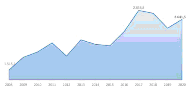 Funzione sicurezza del territorioCon riferimento alla Funzione "Sicurezza del Territorio" - pertinente alle esigenze finanziarie dell'Arma dei Carabinieri - lo stanziamento previsionale per l'esercizio finanziario 2020 ammonta a circa 7.054,9 M€ mentre per il 2021 e 2022 si attesterà rispettivamente a 7.092,3 M€ e7.137,1 M€, con un incremento di 45,5 M€ per il 2021 e di 78,6 M€ per il 2022. La tabella e il grafico sottostanteLe risorse assegnate mostrano l'ammontare delle risorse per il triennio 2017-2019 e la ripartizione delle spese per il 2020 tra personale (91,3% ), esercizio (6,9%) e investimento (1,8%). Figura 14 - Serie storica delle spese della Funzione Sicurezza del territorio ripartite per settori 2017-2020