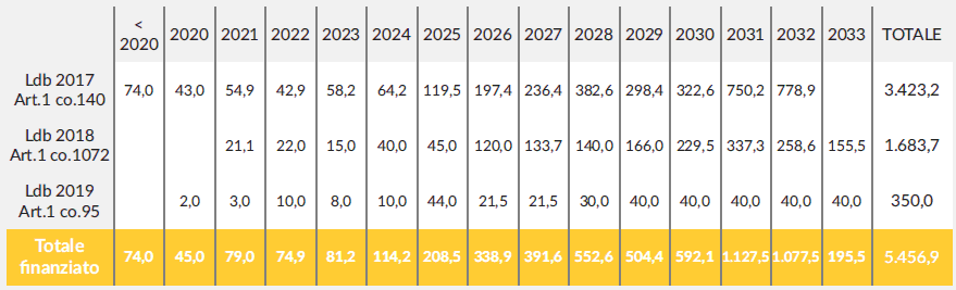 Le disponibilità complessive nel settore sono comprensive delle integrazioni derivanti dai "fondi di investimento pluriennali" previsti dall'art. 1, commi 140, 623, 1072 e 95 delle leggi di bilancio per gli anni