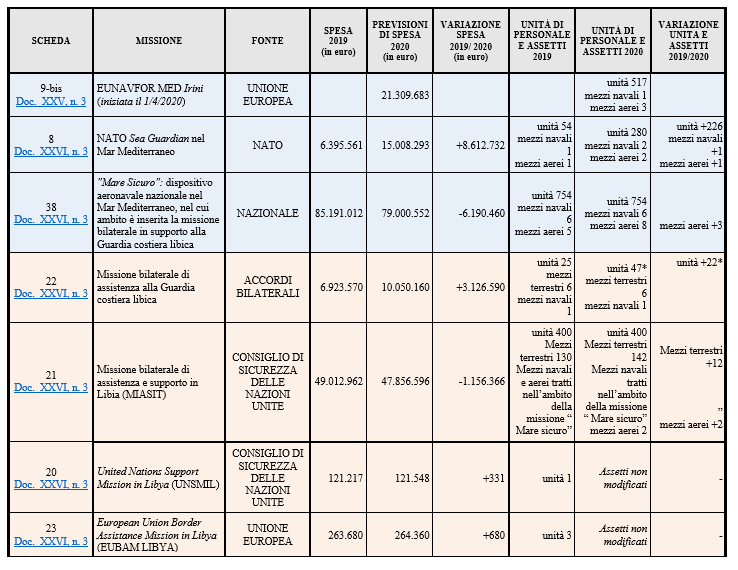 Per il 2020, a seguito della evoluzione della crisi libica, il dispositivo aeronavale, è stato potenziato al fine di contribuire ad arginare il fenomeno dei traffici illeciti e rafforzare le capacità di controllo da parte delle autorità libiche. L'Italia partecipa al complesso delle operazioni indicate nella scheda n. 38 del Doc. XXVI, n. 3 con 754 unità di personale militare, con l'impiego di 6 mezzi navali (di cui uno dedicato all'assistenza tecnica della marina/guardia costiera libica) e di 8 mezzi aerei. Il fabbisogno finanziario della missione per il 2020 è stimato in euro 79.000.552 (di cui 17 milioni per obbligazioni esigibili nell'anno 2021).