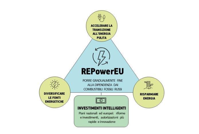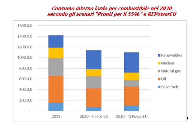 REPowerEU) entro il 2030 (rispetto al 2019). Oltre ad una quota maggiore di rinnovabili, REPowerEU prevede più drastica riduzione del consumo di gas naturale ed un maggiore ricorso a nucleare e combustibili solidi.