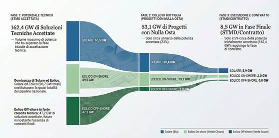 [5] Tale categorizzazione, mutuata dallo studio “Il recente sviluppo delle energie rinnovabili in Italia“, di Banca d ‘Italia, n. 908, febbraio 2025, include sia le richieste per le quali Terna deve ancora elaborare un preventivo di connessione (la cd. soluzione tecnica minima generale - STMG), sia quelle per le quali i proponenti stanno visionando o hanno accettato la STMG ricevuta, sia quelle per le quali Terna sta verificando la conformità agli standard tecnici del progetto operativo proposto dal richiedente per realizzare la connessione.