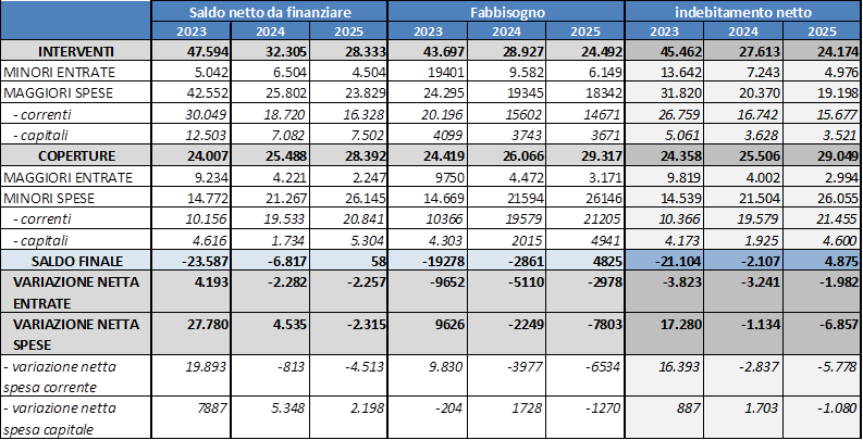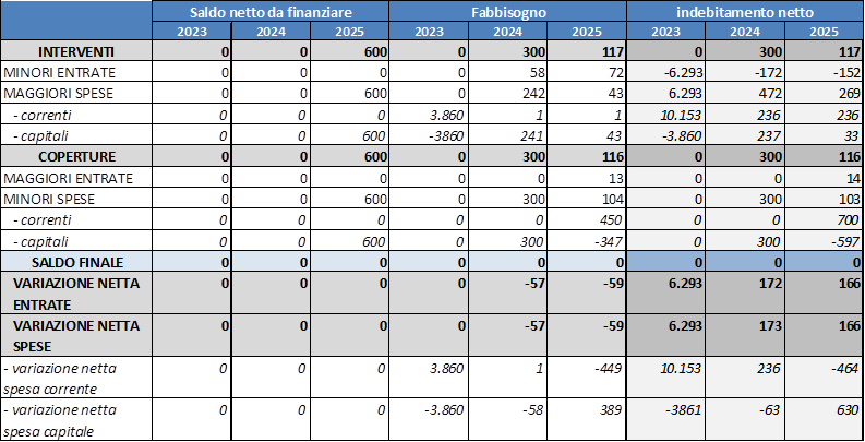 Sulla base di approfondimenti effettuati e di informazioni acquisite presso gli uffici competenti, le riclassificazioni operate dalla NTI rispetto al prospetto riepilogativo degli effetti della legge di bilancio 2023-2025, risultano ascrivibili principalmente ai seguenti fattori (si fa riferimento al saldo dell’indebitamento netto):
