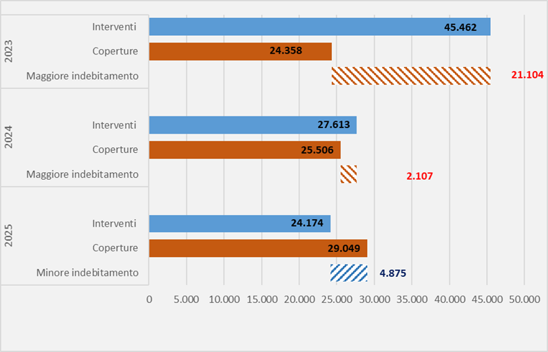 · una riduzione del ricorso all’indebitamento (minor deficit) per circa 4,9 miliardi nel 2025.