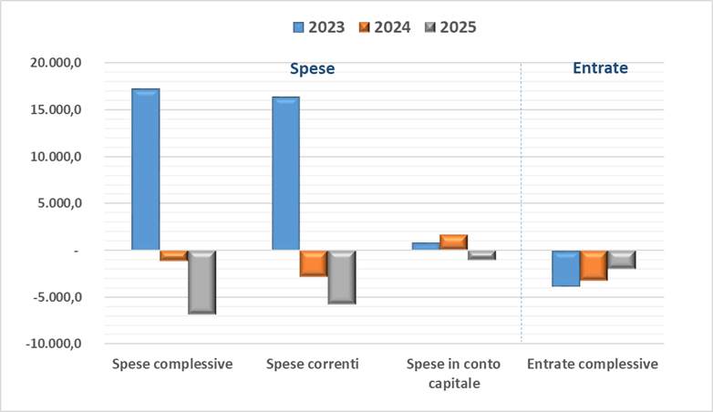 Si evidenzia per il 2023 un saldo netto da finanziarie di competenza pari a 201 miliardi, dovuto a entrate finali pari a 672 miliardi e spese finali pari a 873 miliardi. Nel 2024 il saldo netto da finanziare è pari a 134 miliardi (le entrate finali si attestano a 674 miliardi e le spese finali a 808 miliardi). Nel 2025 il saldo netto da finanziare è pari a 113 miliardi: le entrate finali si attestano a 693 miliardi e le spese finali a 806 miliardi.