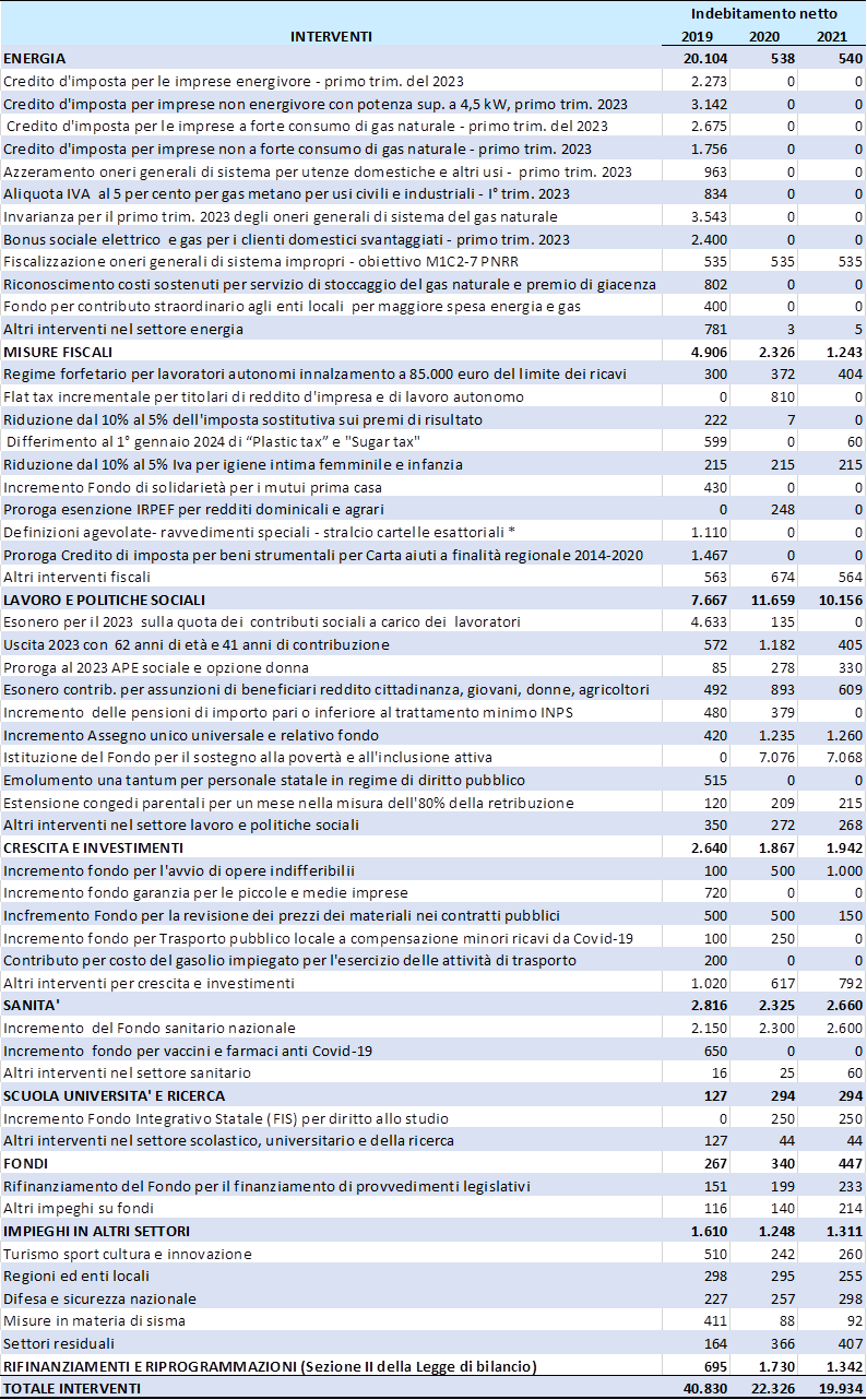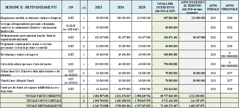 [9] La NTI riporta distintamente gli effetti della legge di bilancio 2023-2025 e quelli del DL 176/2022, nonché la corrispondente somma. Qui si considerano unicamente gli importi relativi alla legge di bilancio 2023-2025.
