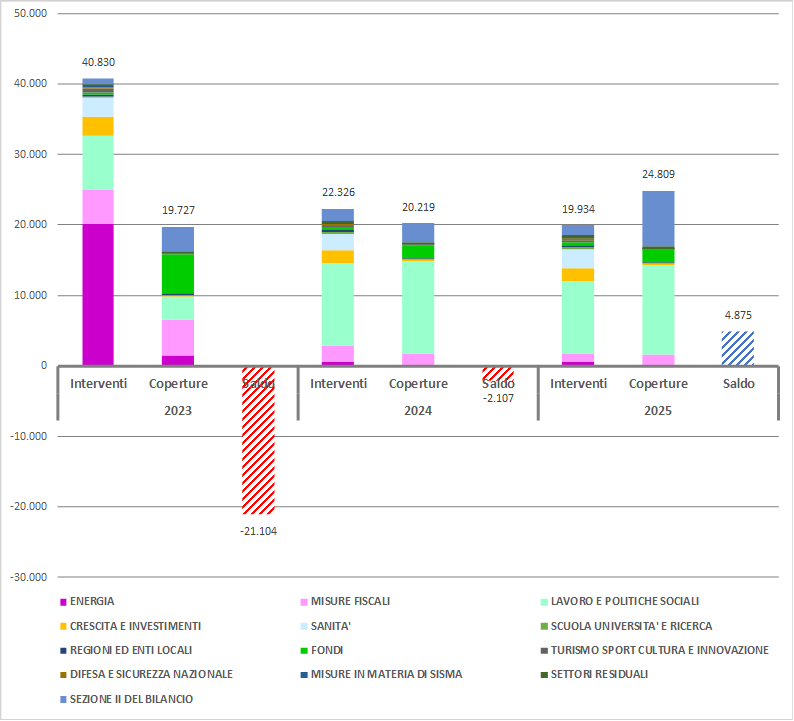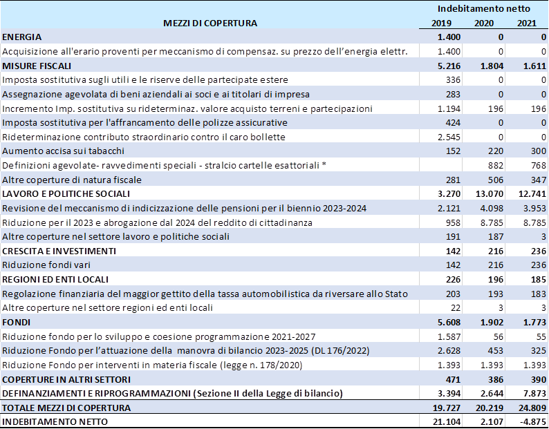 A fronte di tali interventi, i mezzi di finanziamento (risorse che configurano mezzi di copertura della manovra) previsti dalla legge di bilancio ammontano, rispettivamente, a 24,4 miliardi per il 2023, 25,5 miliardi per il 2024 e 29 miliardi per il 2025.