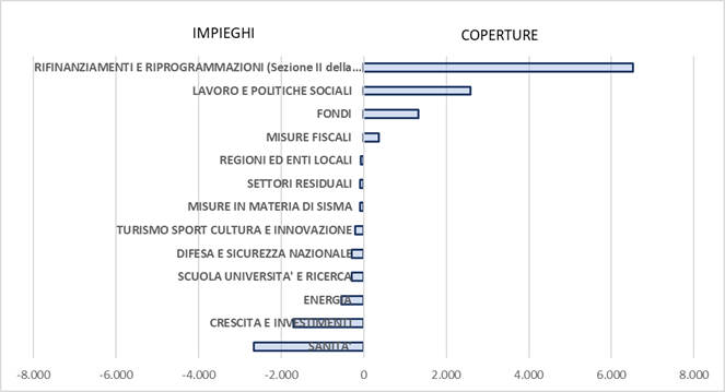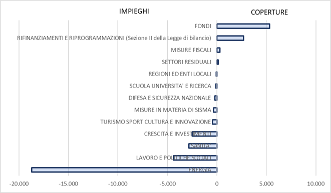 Come ricordato in premessa e per le ragioni ivi evidenziate, le tabelle e i grafici di questo paragrafo adottano un approccio contabile lordo, che include tra gli impieghi tutti gli effetti aventi un segno peggiorativo dei saldi di finanza pubblica e tra le risorse tutti gli effetti aventi un segno migliorativo dei saldi, senza operare compensazioni tra eventuali effetti di segno opposto ascrivibili alla medesima misura.