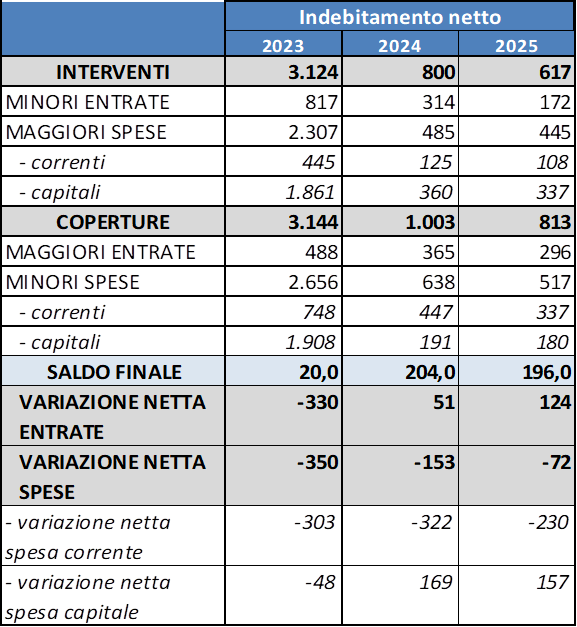 Variazioni più contenute riguardano gli effetti netti della legge di bilancio sulle entrate, che registrano una riduzione di circa 3,8 miliardi nel 2023, di 3,2 miliardi nel 2024 e di 2 miliardi nel 2025.