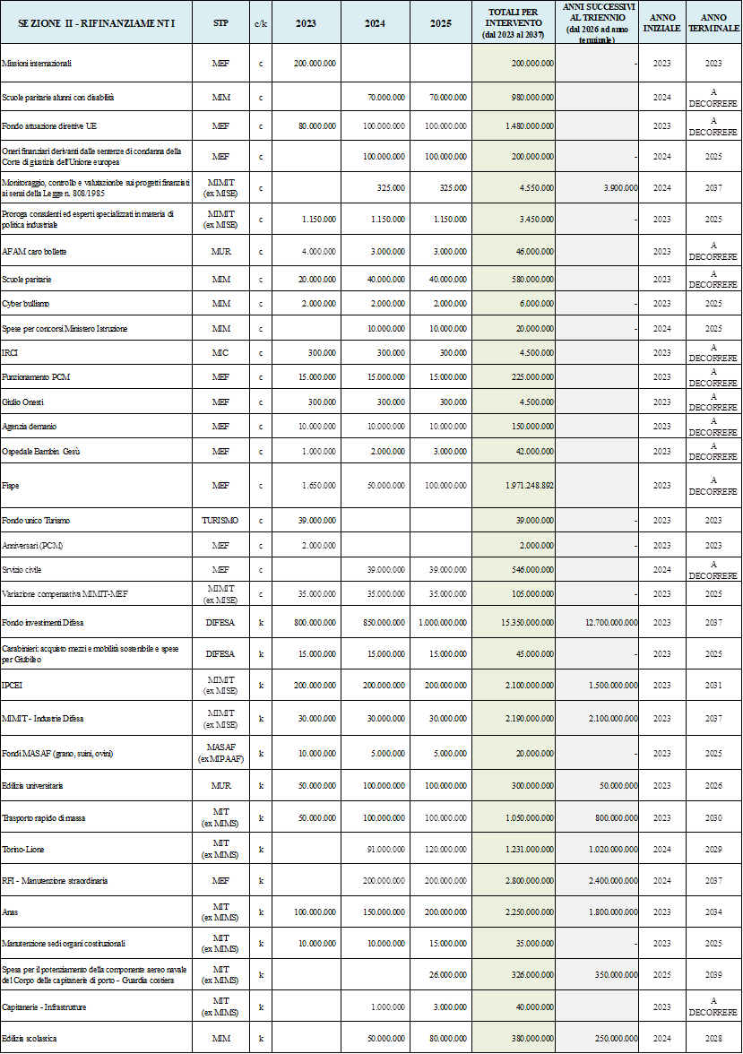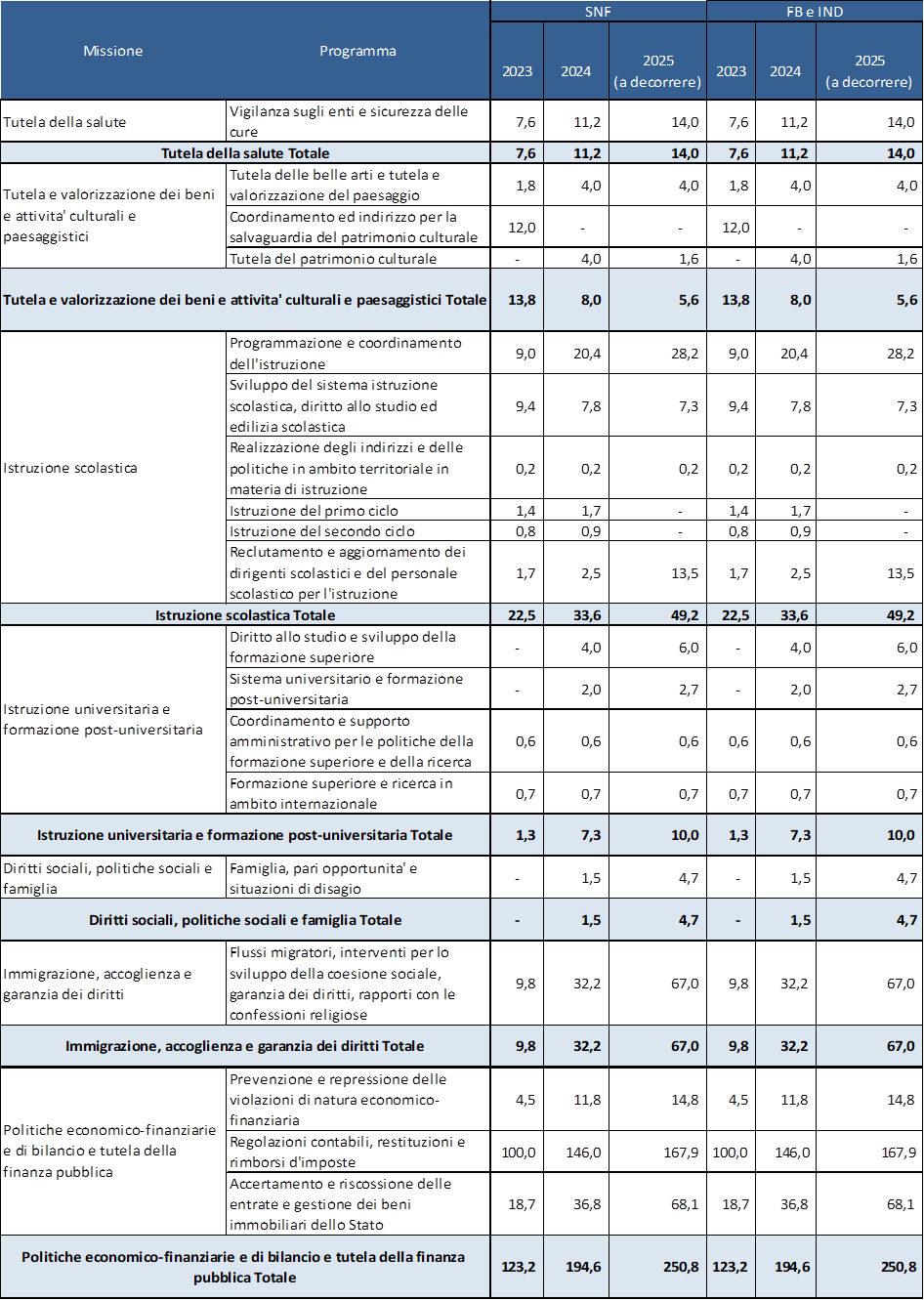 Fonte: Tabelle 2.1-1, 2.1-2 e 2.1-3 della Nota tecnico illustrativa alla Legge di bilancio 2023-2025.