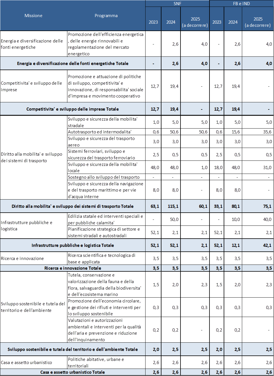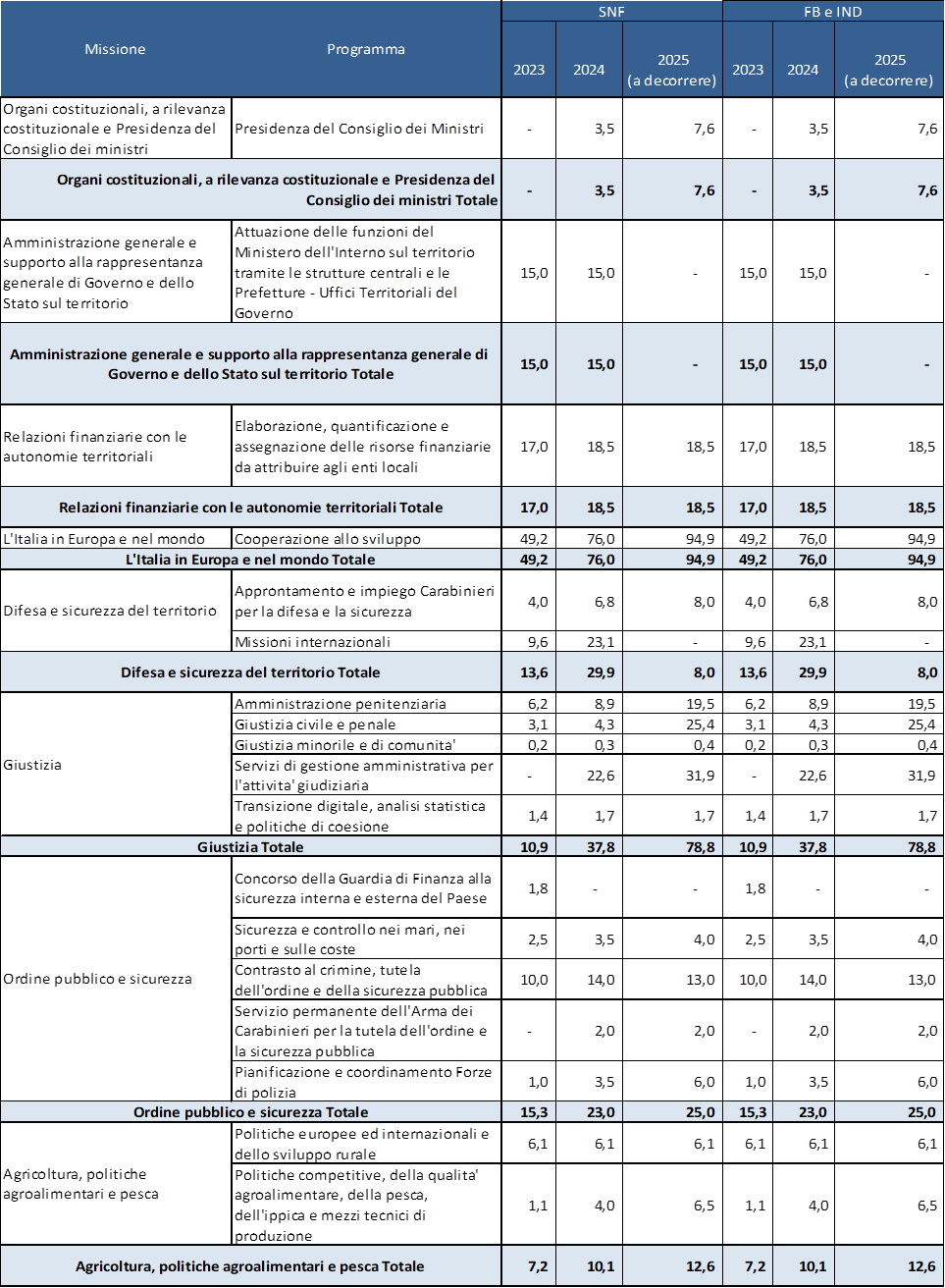 Fonte: elaborazioni su dati delle Tabelle 2.1-1, 2.1-2 e 2.1-3 della Nota tecnico illustrativa alla Legge di bilancio 2023-2025 e su dati del prospetto riepilogativo allegato alla Legge di bilancio 2023-2025.